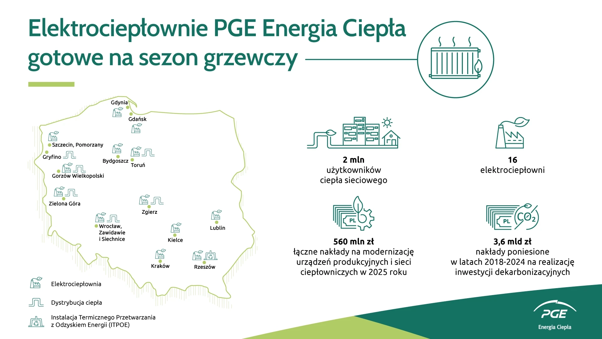 Elektrociepłownie PGE Energia Ciepła z Grupy PGE są przygotowane na rozpoczęty sezon grzewczy. W niektórych lokalizacjach ciepło do ogrzewania mieszkań i budynków jest w tym sezonie po raz pierwszy dostarczane z nowo uruchomionych instalacji wytwórczych, które są częścią transformacji ciepłownictwa PGE Energia Ciepła realizowanego w ramach dekarbonizacji sektora.