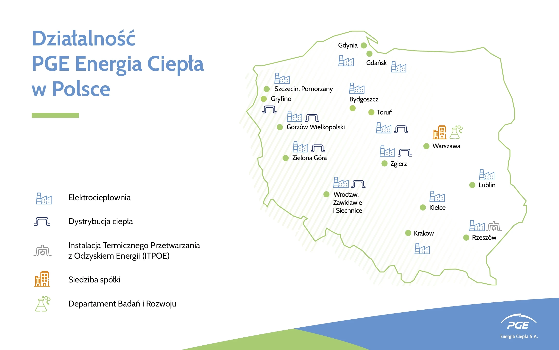 PGE Energia Ciepła produkuje i dostarcza ciepło dla dużych, polskich miast, wśród których znajdują się: Kraków, Gdańsk, Gdynia, Wrocław (w tym wrocławskie Zawidawie), Rzeszów, Lublin, Szczecin, Bydgoszcz i Kielce; spółka jest obecna także w Toruniu, Zielonej Górze, Gorzowie Wielkopolskim, Zgierzu, Siechnicach i Gryfinie, gdzie jest również dystrybutorem ciepła do klientów końcowych.